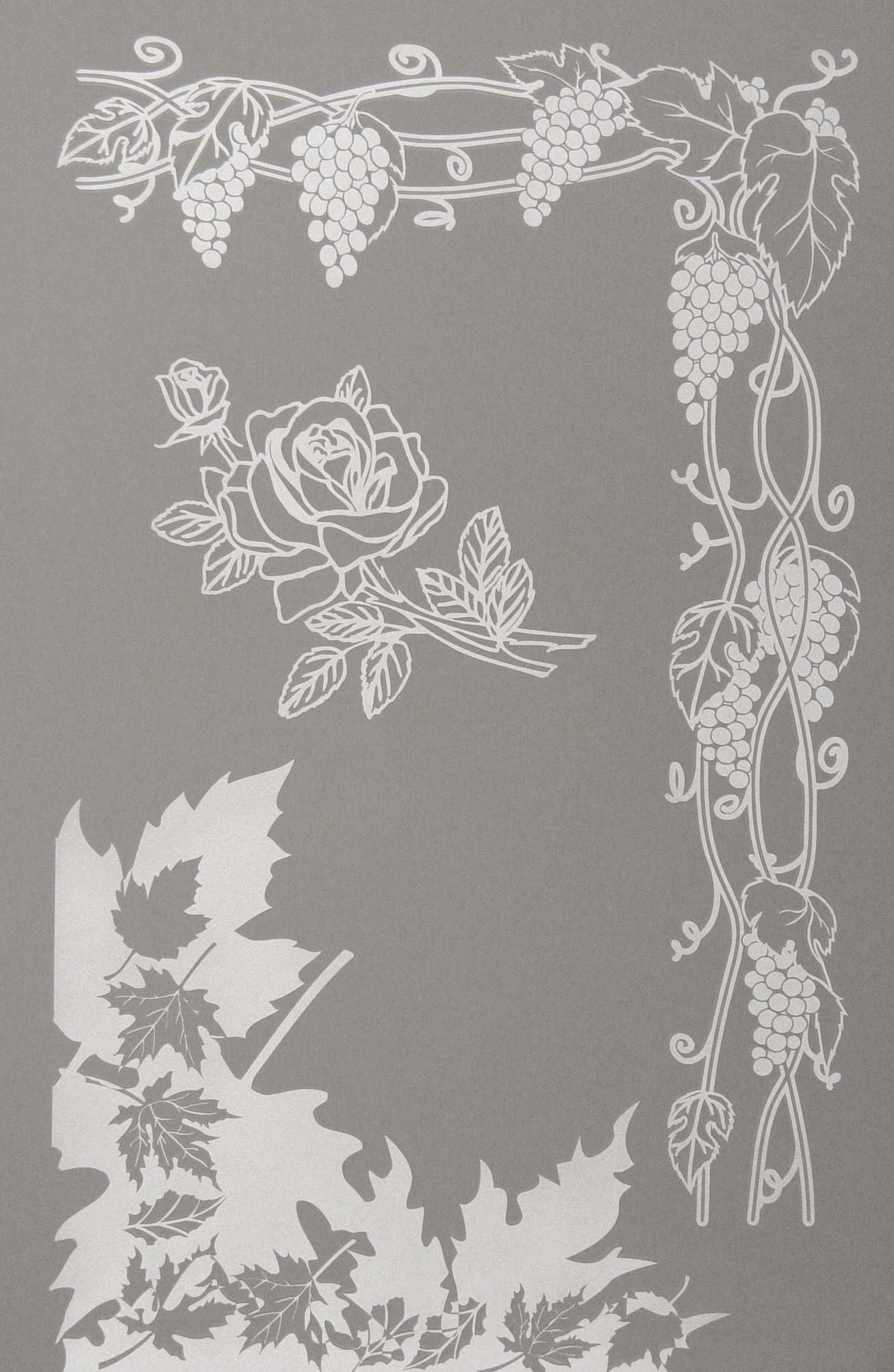 This pantry glass has a busy design on the back and a simple design on the front. This type of design is used when you don't want to see through the glass. This piece's transparency is about 40%. You can see the black sheet partially in the background. You could use a solid etch on the back. Then you could not see through at all. This would also makes the design harder to see. For a solid etch application, it is best to carve the design in the glass. Then the entire glass surface is etched.